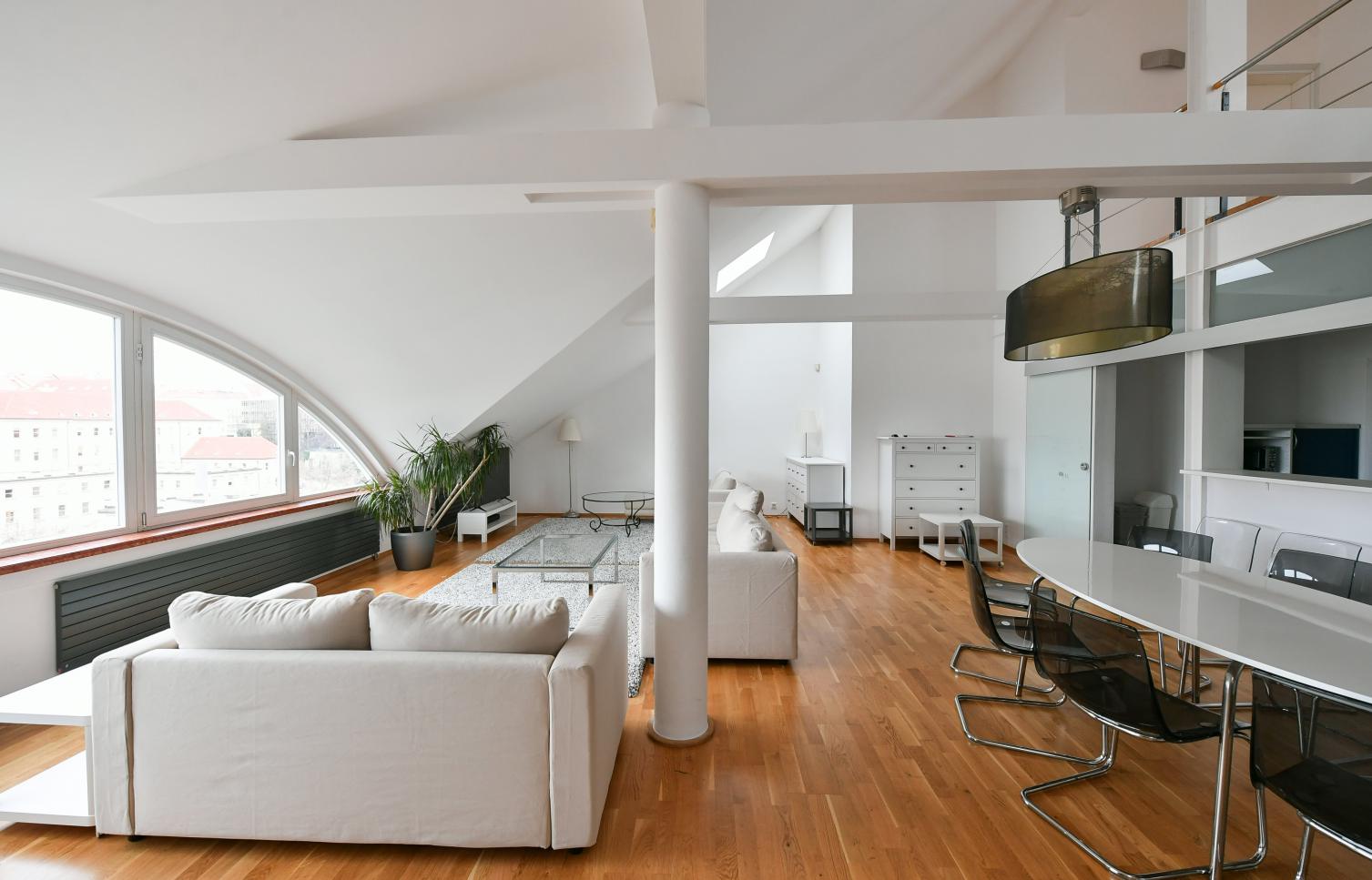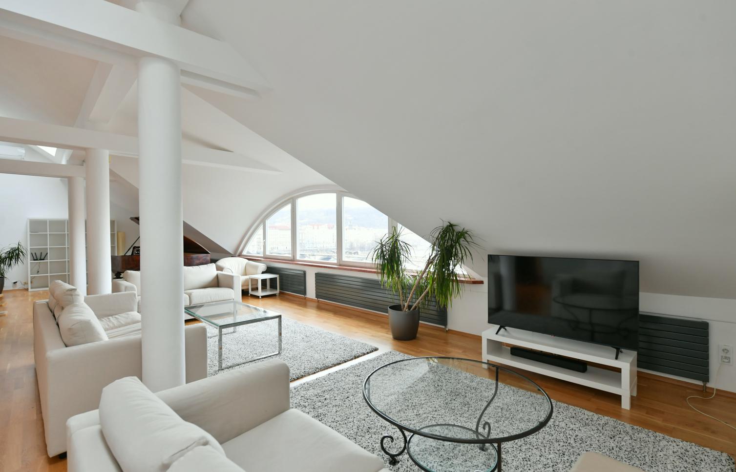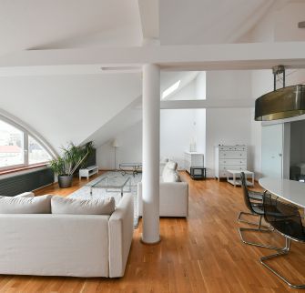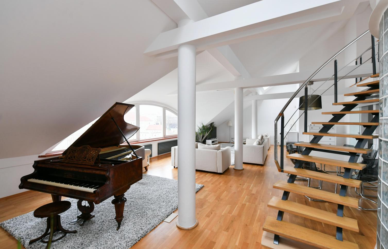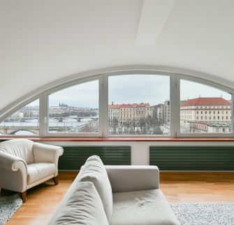 Benefiting from imposing views, encompassing the Prague Castle, National Theatre, Petrin Hill, Žofín Palace, this is a fabulous, airconditioned river-facing attic duplex expressing warm and impressive ambiance. Set on the 5th / 6th floor of a fully renovated Art Nouveau building that has undergone an extensive renovationon retaining many original features of Art-Deco style, with a new lift and well maintained common areas. Fabulous in-town location, with all the comforts of the city center, as it is within walking distance of all the key attractions in Prague. In addition, many cultural activities, as well as restaurants, bars, cafes, clubs, theaters, galleries, cinemas are nearby. Farmers market "Náplavka" is an unforgettable social event and integral part of life in Masaryk Quay. Its unique atmosphere attracts citizens from all parts of Prague for regular visits. A short walk will get you to the Karlovo nám. Metro Station, where all of Prague is at your disposal. Convenient to the French School / Lyceé Francais, (2 tram stops).