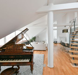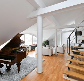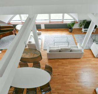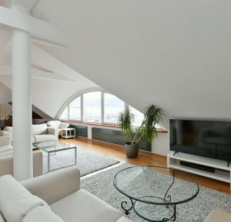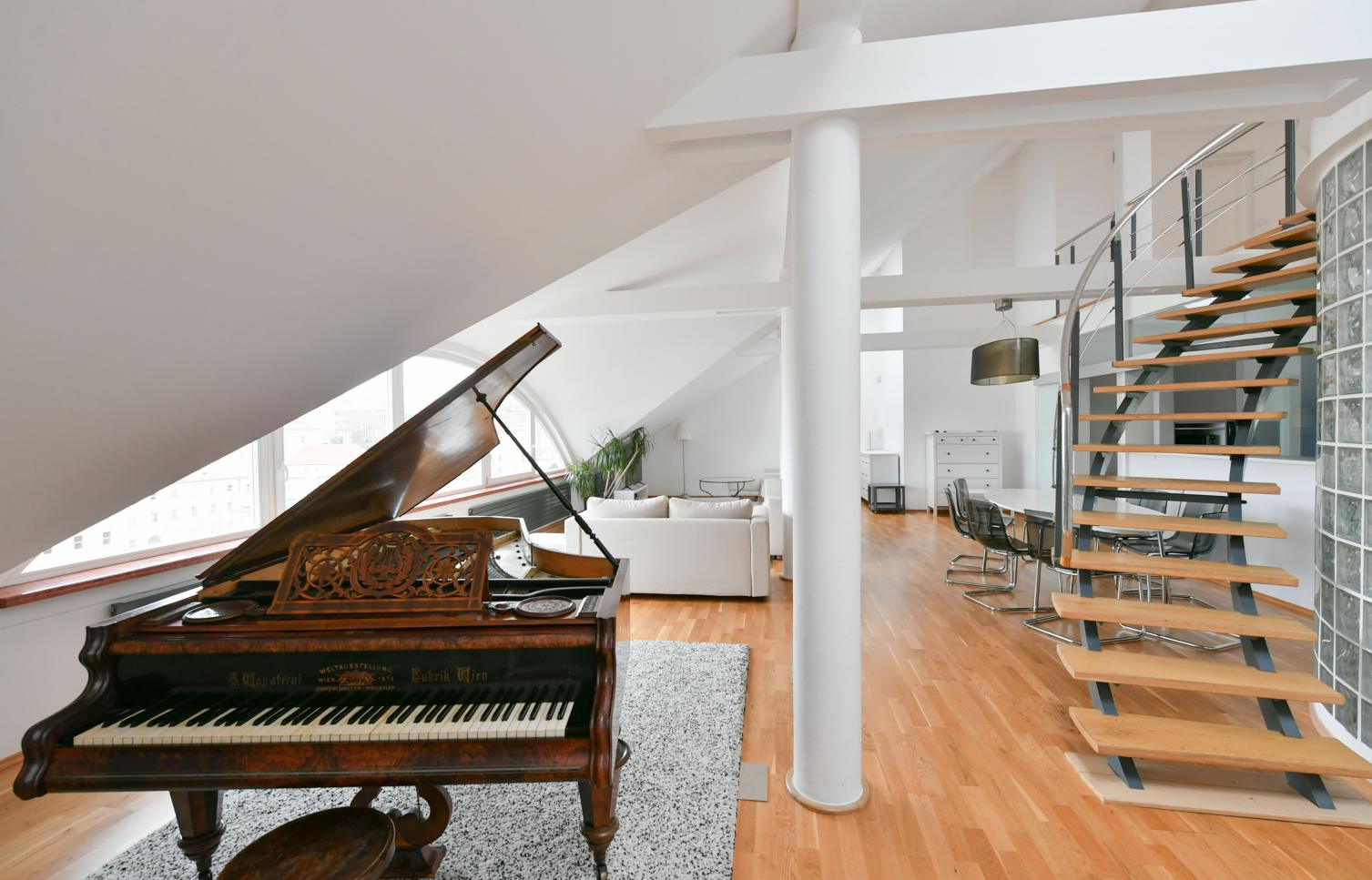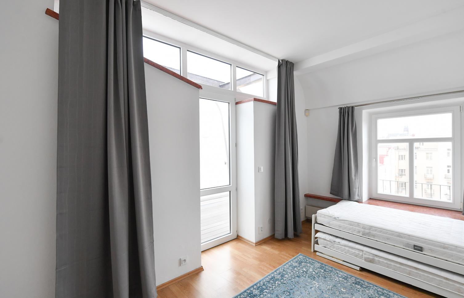 Benefiting from imposing views, encompassing the Prague Castle, National Theatre, Petrin Hill, Žofín Palace, this is a fabulous, airconditioned river-facing attic duplex expressing warm and impressive ambiance. Set on the 5th / 6th floor of a fully renovated Art Nouveau building that has undergone an extensive renovationon retaining many original features of Art-Deco style, with a new lift and well maintained common areas. Fabulous in-town location, with all the comforts of the city center, as it is within walking distance of all the key attractions in Prague. In addition, many cultural activities, as well as restaurants, bars, cafes, clubs, theaters, galleries, cinemas are nearby. Farmers market "Náplavka" is an unforgettable social event and integral part of life in Masaryk Quay. Its unique atmosphere attracts citizens from all parts of Prague for regular visits. A short walk will get you to the Karlovo nám. Metro Station, where all of Prague is at your disposal. Convenient to the French School / Lyceé Francais, (2 tram stops).